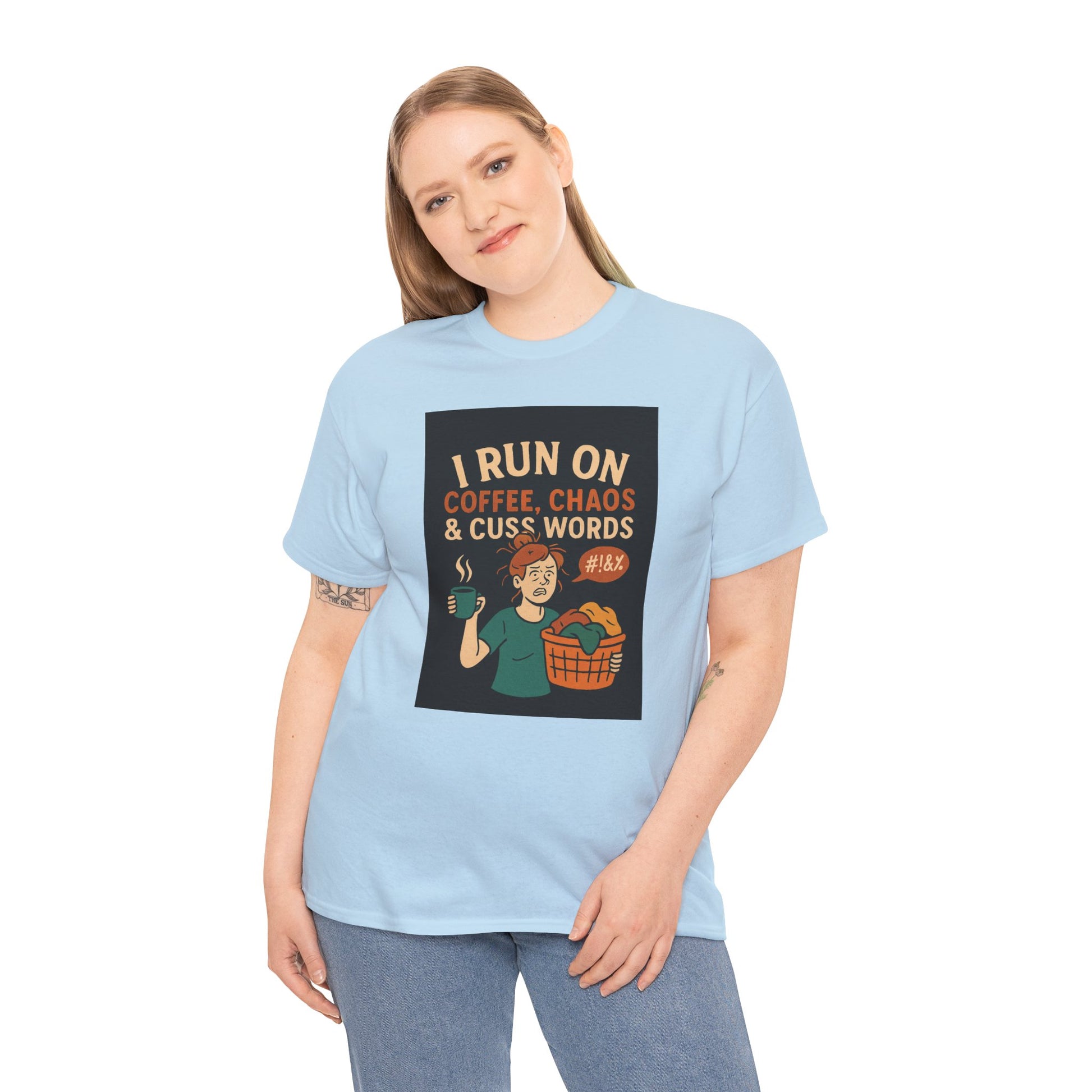 Introducing this Unisex Heavy Cotton Tee – the perfect blend of comfort and style for those who thrive on energy and a bit of humor. This tee features a bold, playful design that simply states, "I RUN ON COFFEE, CHAOS & CUSS WORDS," making it an ideal choice for coffee lovers and those who appreciate a light-hearted take on daily life. It’s not just a tee; it’s a statement piece that humorously encapsulates the busy and chaotic routines many embrace. Whether you’re running errands, heading to a casual get-together, or just lounging around, this shirt fits seamlessly into your lifestyle. It’s a fantastic gift for friends, family, or colleagues who could use a little laughter in their day. Perfect for occasions like birthdays, coffee-themed events, or just to treat yourself during the hectic moments of everyday life.